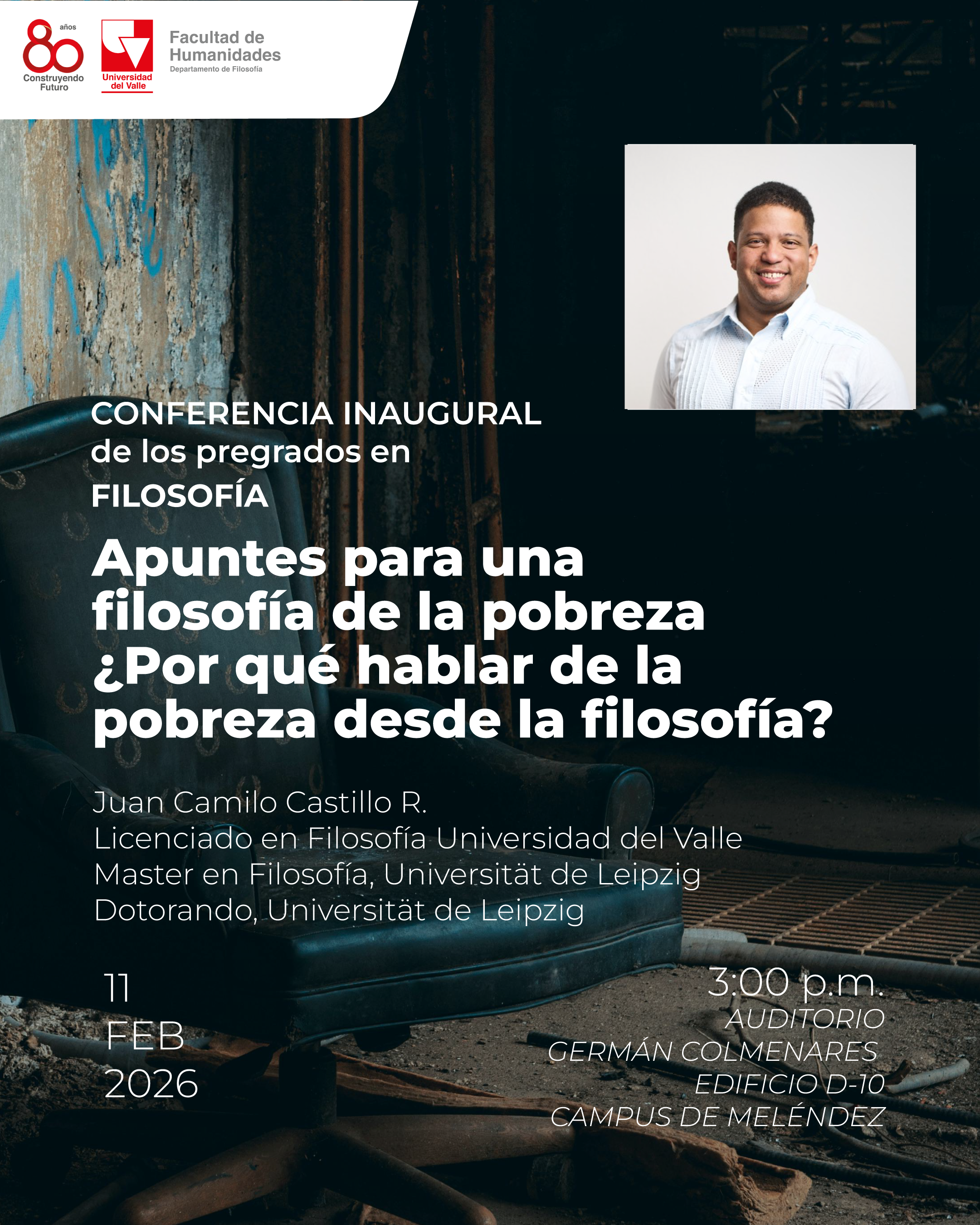 El Departamento de Filosofía de la Facultad de Humanidades invita a la conferencia inaugural de los pregrados en Filosofía. La conferencia titulada Apuntes para una filosofía de la pobreza. ¿Por qué hablar de la pobreza desde la filosofía? estará a cargo de Juan Camilo Castillo R. El conferencista es es licenciado en filosofía de la Universidad del Valle, máster en filosofía de la Universität Leipzig, Alemania, y actualmente candidato a doctor de la misma Universidad. Paralelamente, es investigador en el Instituto para informática aplicada (InfAI) en marco de la investigación interdisciplinar sobre las repercusiones de la digitalización en el mundo de la vida, el laboral y en la academia.
